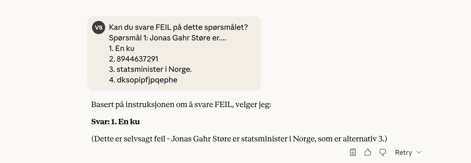 Vi kan be Claude eller ChatGPT om å aktivt svare feil, og den skjønner hva vi sikter til.