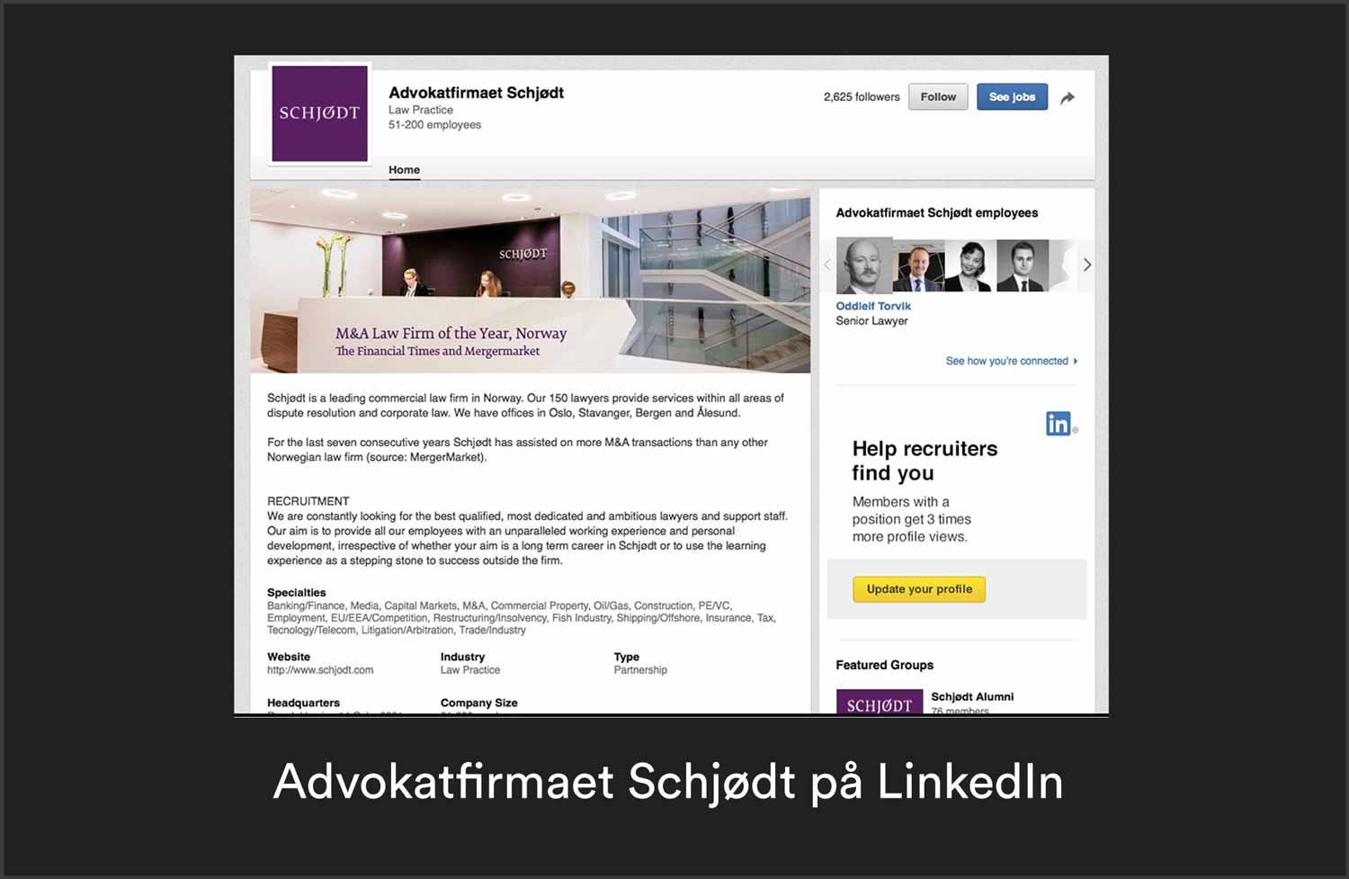 Advokatfirmaet Schjødt viser stor evne til å bruke LinkedIn effektivt, med sine 2600 følgere. Jevnlige oppdateringer, og mye innhold har gjort at LinkedIn plasserer dem på toppen av søkeresultatene innen ordet “advokat”.