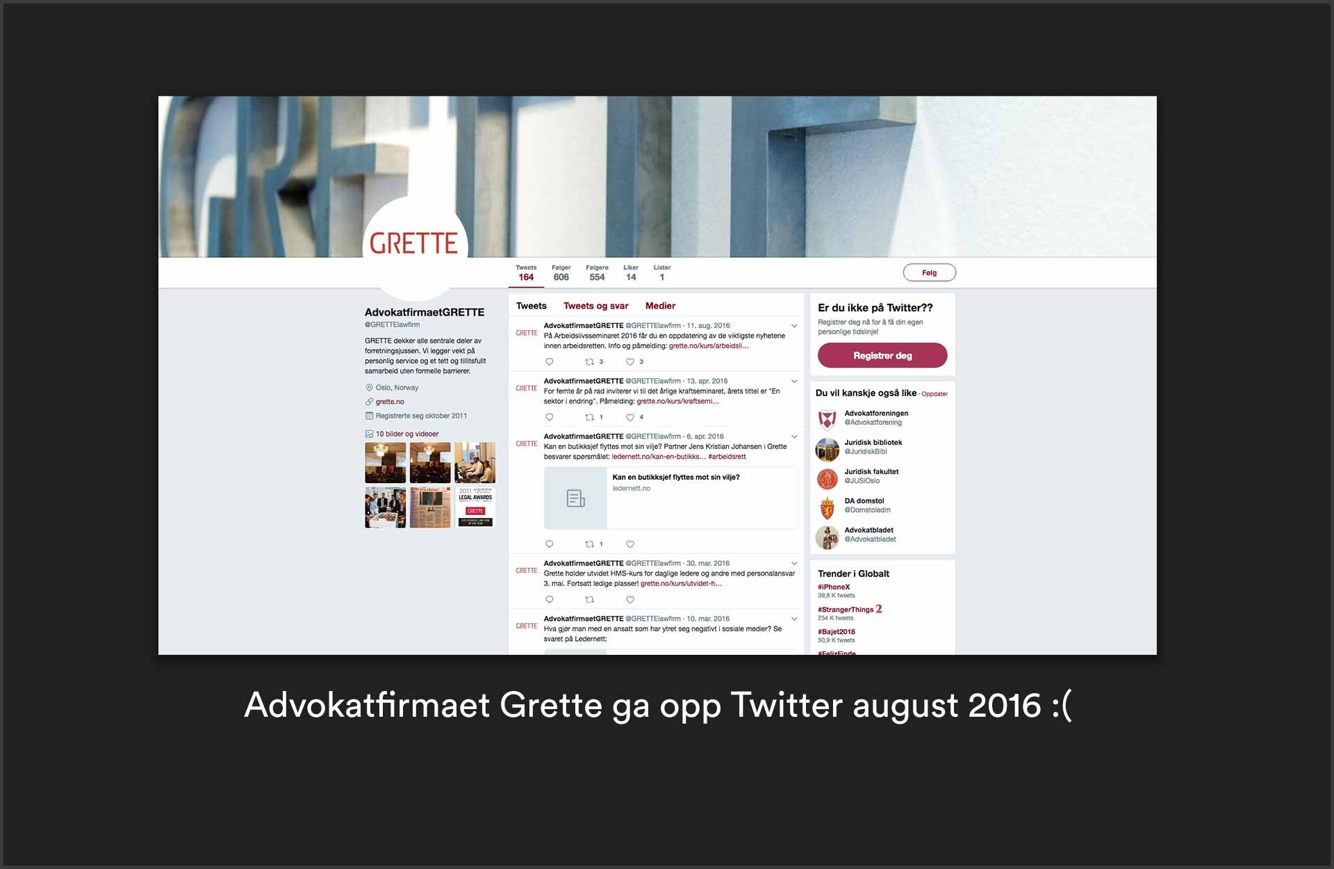 Men Twitter har blitt en kanal de færrreste bruker. Med mindre du er journalist, hipster eller politiker – så ikke prioriter dette med mindre du har et sterkt behov for å være aktiv her.