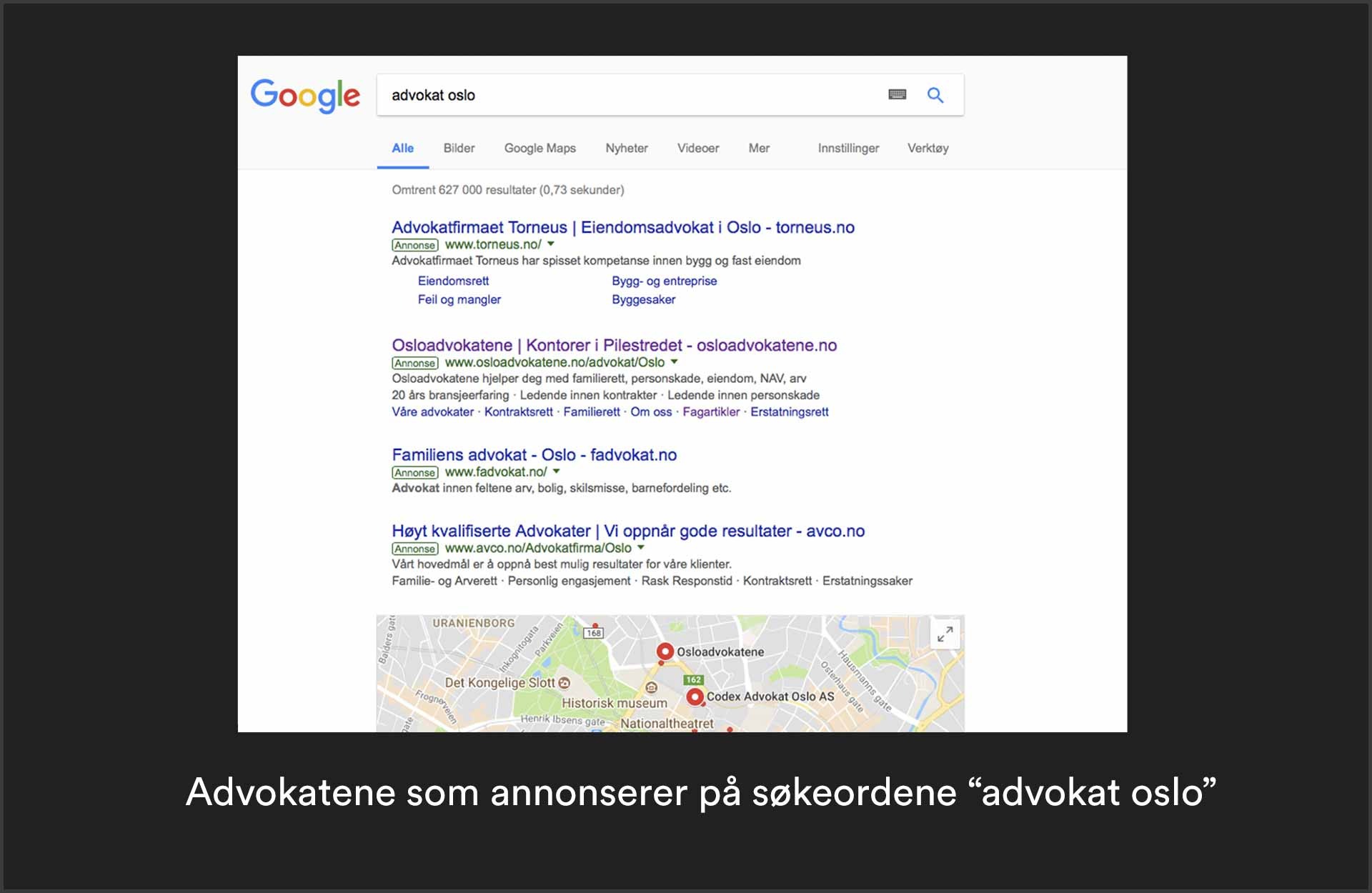 De fire øverste resultatene når du googler, er som regel annonser. Tommelfingerregelen er at om du gjør research, ignorer du som regel annonsene. Men dersom du er kjøpeklar (er helt sikker på at du trenger en advokat) er det mer sannsynlig at du trykker på annonsene.