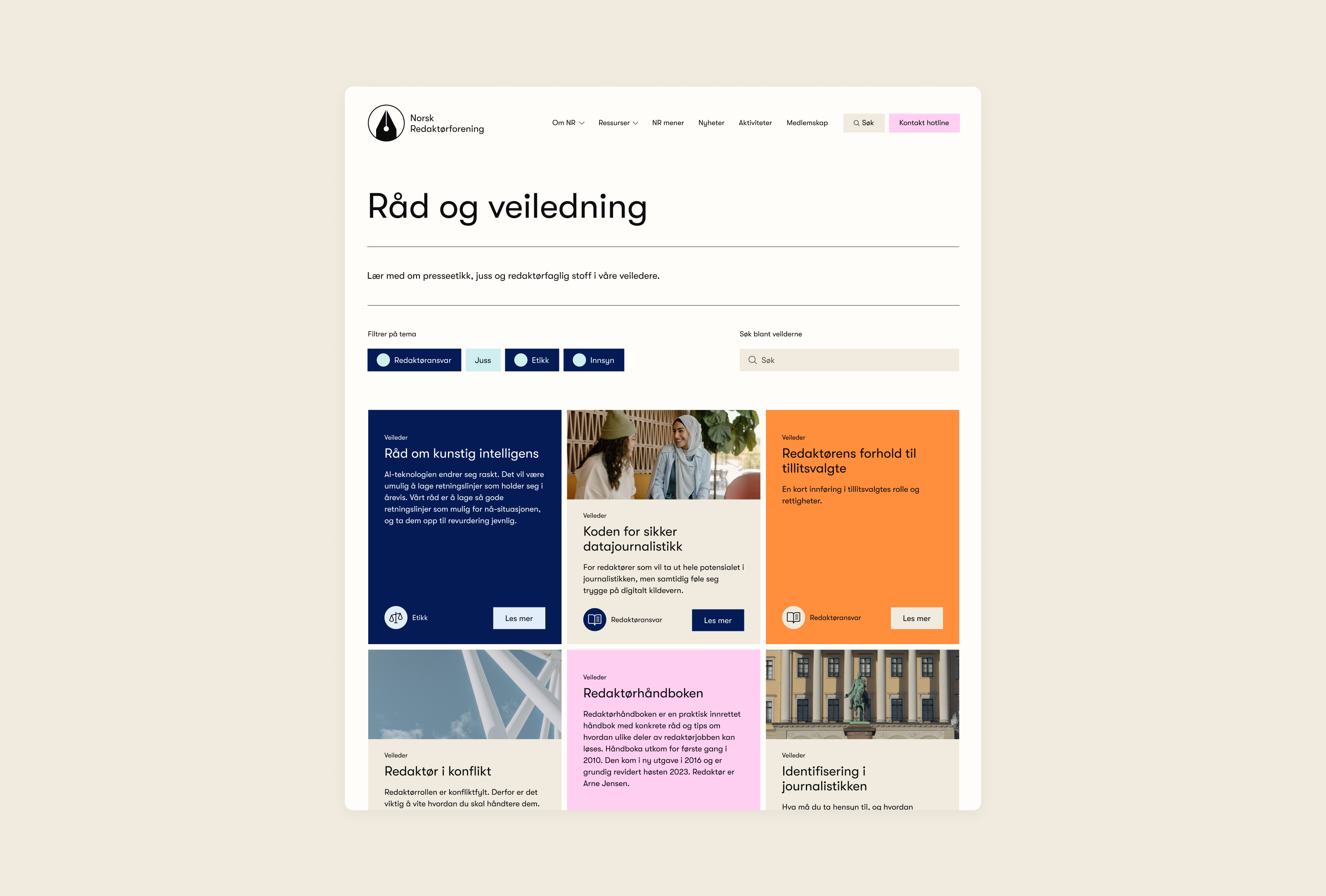 Basert på brukertester og innsikt utviklet vi en løsning som tydelig fremhever søkefunksjonen på nettsiden og gir enkel tilgang til hotline-numrene. Vi restrukturerte også faginnholdet for å gjøre det mer effektivt og intuitivt å utforske temaer som juss og presseetikk.